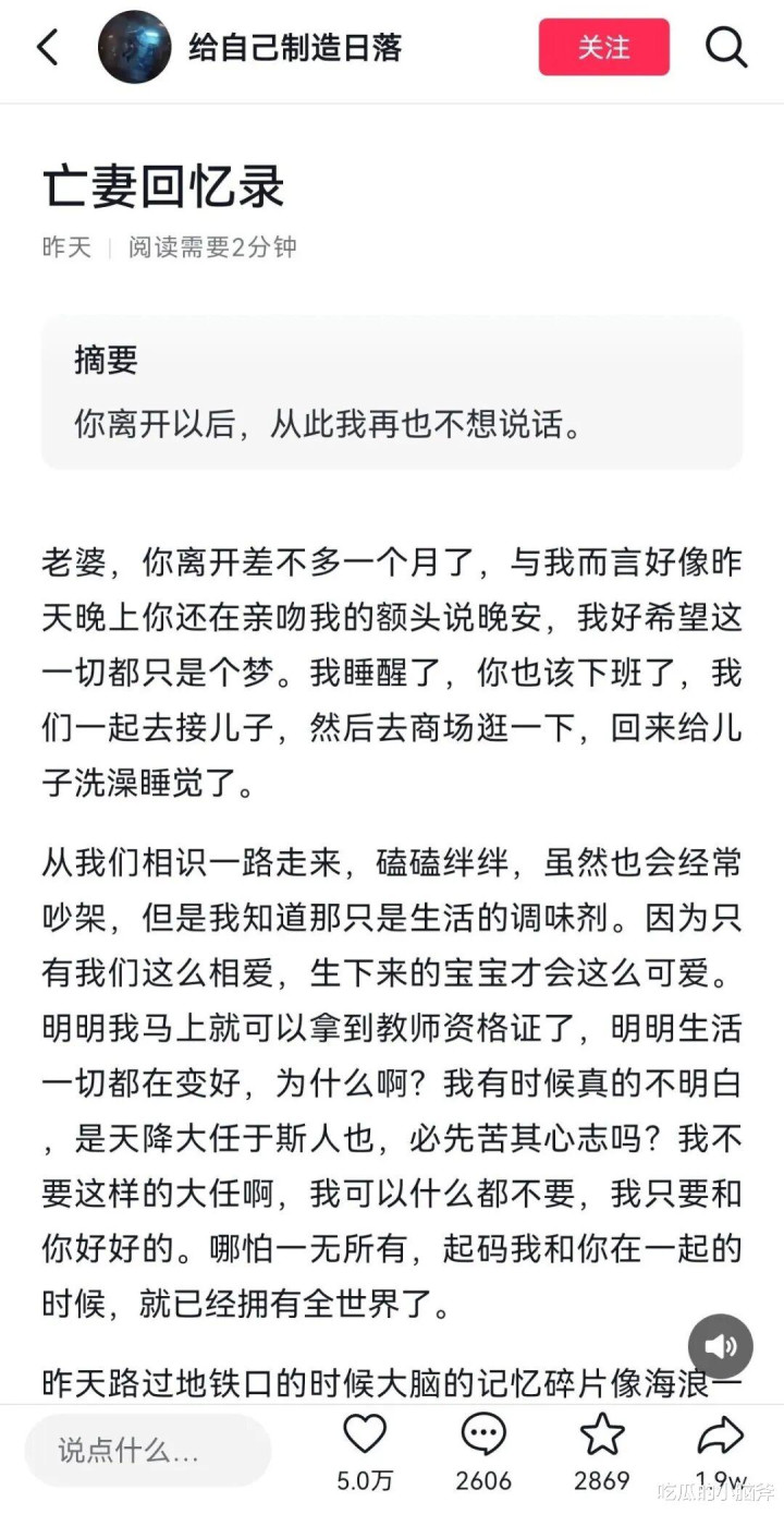 之前也有丈夫思念亡妻殉情,人家是真的走不出来,字里行间全是撕心裂肺的痛,多少网友跟着掉眼泪,甚至自发去悼念。